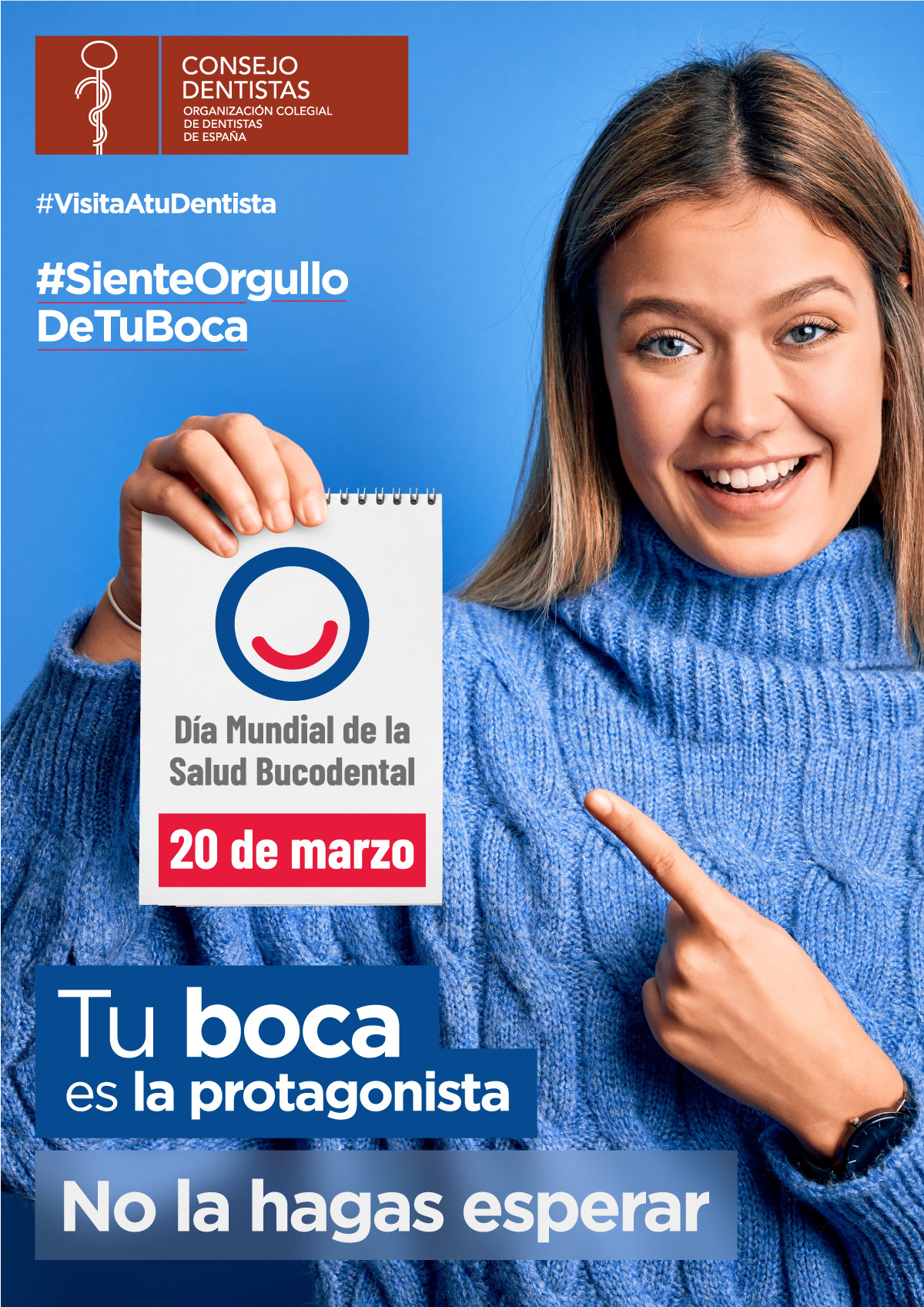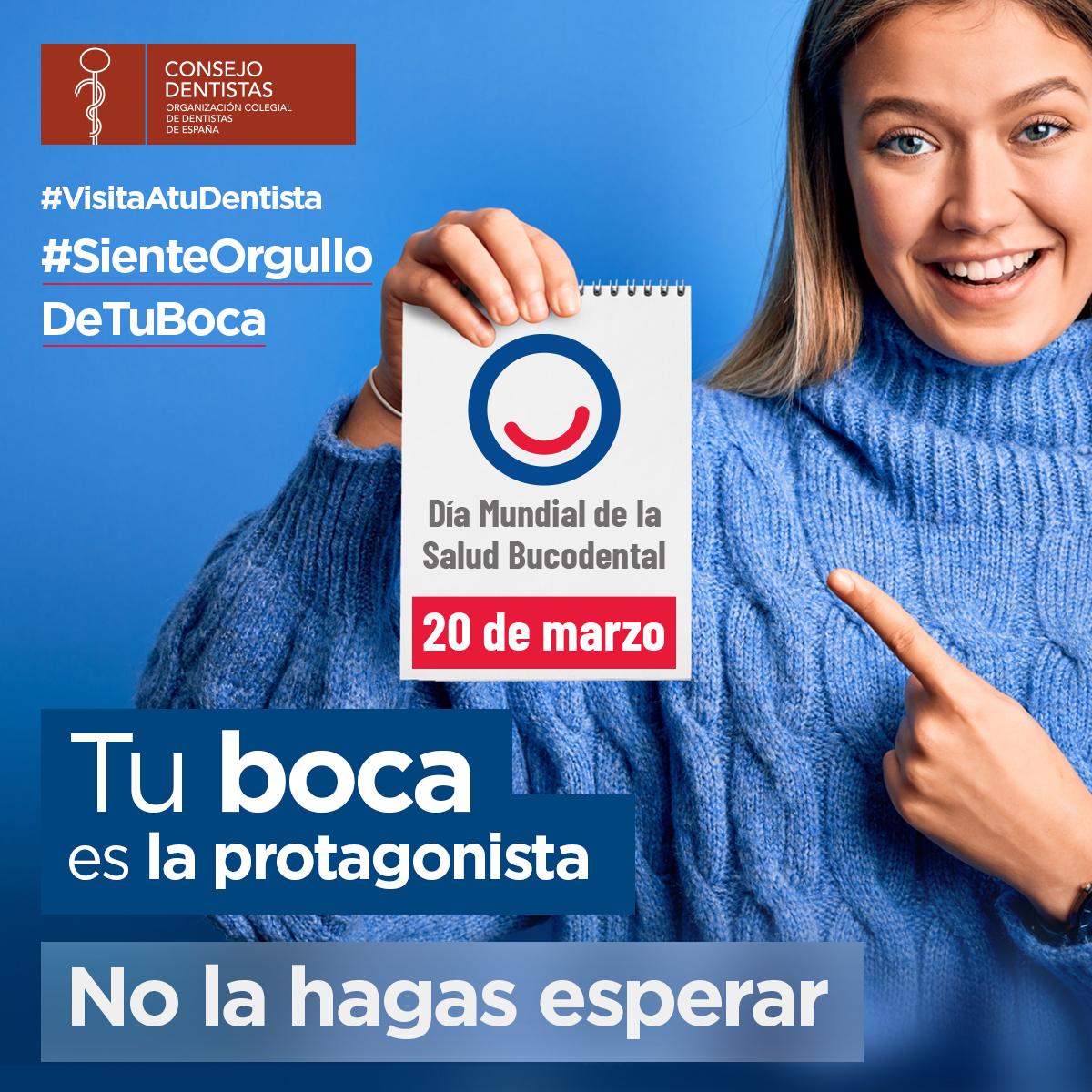 El Consejo General de Dentistas ha lanzado una campaña centrada en el Día Mundial de la Salud Oral, bajo el lema de la Federación Dental Internacional (FDI) #BeProudOfYourMouth, con la traducción #SienteOrgulloDeTuBoca. El mensaje central de la campaña es resaltar la necesidad de acudir al dentista y no retrasar los tratamientos, ya que una patología leve puede derivar en graves complicaciones. Asimismo, se insiste en la seguridad de las clínicas dentales, donde se cumplen todas las medidas de protección y desinfección, tanto para los pacientes como para los trabajadores.